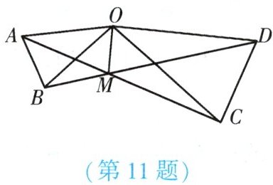 11. (★★)如图,在△AOB和△COD中,OA= OB,OC= OD,OA<OC,∠AOB= ∠COD= 36°,AC与BD交于点M,连接OM.有下列结论:①∠AMB= 36°;②AC= BD;③OM平分∠AOD;④MO平分∠AMD.其中正确的结论个数是【