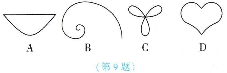 9. (★) (2024·滨州) 数学中有许多精美的曲线,以下是“悬链线”“黄金螺旋线”“三叶玫瑰线”和“笛卡儿心形线”. 其中不是轴对称图形的是 【