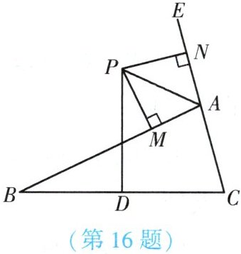 16. 如图,在 $ \triangle ABC $ 中,$ BC $ 的垂直平分线与外角 $ \angle EAB $ 的平分线交于点 $ P $,$ PM \perp AB $ 于点 $ M $,$ PN \perp AE $ 于点 $ N $。