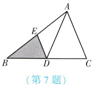 7. (★★)如图,已知 $ \triangle ABC $ 中,$ D,E $ 分别是边 $ BC,AB $ 的中点. 若 $ \triangle ABC $ 的面积等于 $ 8 $,则 $ \triangle BDE $ 的面积等于【