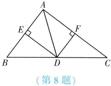 8. (★★)如图,在 $ \triangle ABC $ 中,$ AD $ 为中线,$ DE $ 和 $ DF $ 分别为 $ \triangle ADB $ 和 $ \triangle ADC $ 的高. 若 $ AB = 6 $,$ AC = 8 $,$ DF = 3 $,则 $ DE $ 的长为
