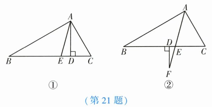 21. (10分)(1)如图①,在△ABC中,AD,AE分别是△ABC的高和角平分线,若∠B= 30°,∠C= 50°,求∠DAE的度数.