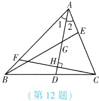 12. (★★)如图,在 $ \triangle ABC $ 中,$ \angle 1 = \angle 2 $,$ G $ 为 $ AD $ 的中点,连接 $ BG $ 并延长 $ BG $ 交 $ AC $ 于点 $ E $,$ F $ 为 $ AB $ 上的一点,$ CF \perp AD $ 于点 $ H $. 下列判断错误的是【
