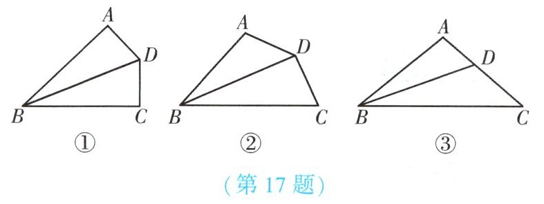17. (★★★)如图①和图②,在四边形 $ ABCD $ 中,$ \angle BAD = \alpha $,$ \angle BCD = 180^{\circ} - \alpha $,$ BD $ 平分 $ \angle ABC $。