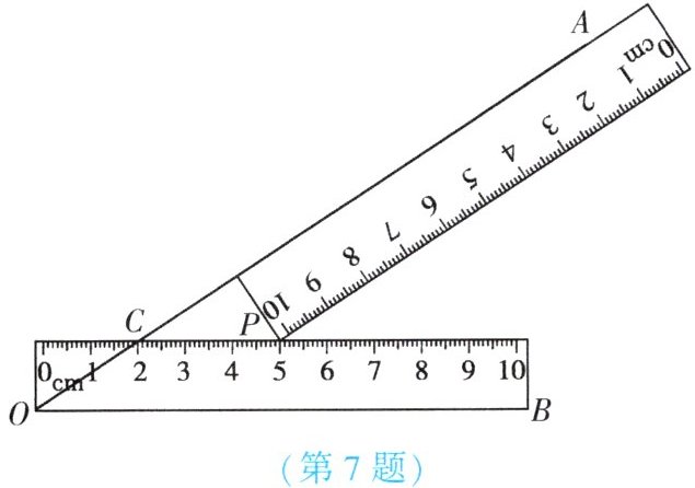 7. (★★)小明将两把完全相同的长方形直尺如图放置在∠AOB 上,两把直尺的接触点为 P,边 OA 与其中一把直尺边缘的交点为 C,点 C,P 在这把直尺上的刻度读数分别是 2 和 5,则 OC 的长度是【