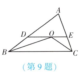 9. (★★)如图,在△ABC 中,∠ABC 与∠ACB 的平分线交于点 O,过点 O 作 DE//BC,分别交 AB,AC 于点 D,E。若 AB = 9,AC = 6,则△ADE 的周长为