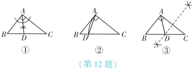 12. (★)在△ABC 中,已知∠BAC = 90°,AB ≠ AC,若用无刻度的直尺和圆规在 BC 上找一点 D,使△ACD 是等腰三角形,则下列作法正确的有【