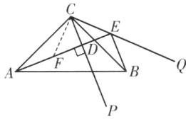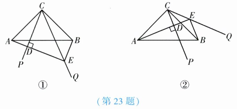 23. (12分)如图,在$\triangle ABC$中,$\angle ACB = 90^{\circ}$,$AC = BC$,$\angle PCQ = 45^{\circ}$,把$\triangle PCQ绕点C$旋转,在整个旋转过程中,过点$A作AD\perp CP于点D$,直线$AD交CQ于点E$.
