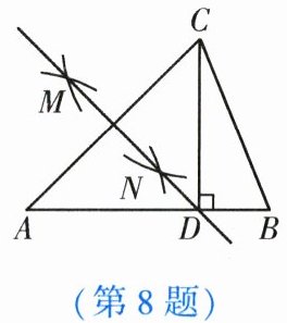 8. 如图, $ CD $ 是 $ \triangle ABC $ 的边 $ AB $ 上的高, 且 $ AB = AC $. 分别以点 $ A,C $ 为圆心, 以大于 $ \frac{1}{2}AC $ 的长为半径作弧, 两弧的交点为 $ M,N $, 直线 $ MN $ 恰好经过点 $ D $, 则 $ \angle BCD $ 的度数为 【