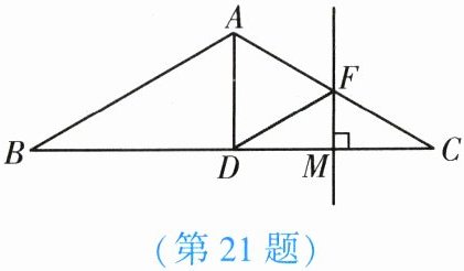 21. (10 分) 如图, 在 $ \triangle ABC $ 中, $ AB = AC, \angle BAC = 120^{\circ} $, $ AD $ 是边 $ BC $ 上的中线, $ CD $ 的垂直平分线 $ MF $ 交 $ AC $ 于点 $ F $, 交 $ BC $ 于点 $ M $, 连接 $ DF $.