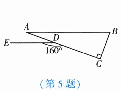 5. 如图,在△ABC中,∠C= 90°,点D在AC上,DE//AB,若∠CDE= 160°,则∠B的度数为【