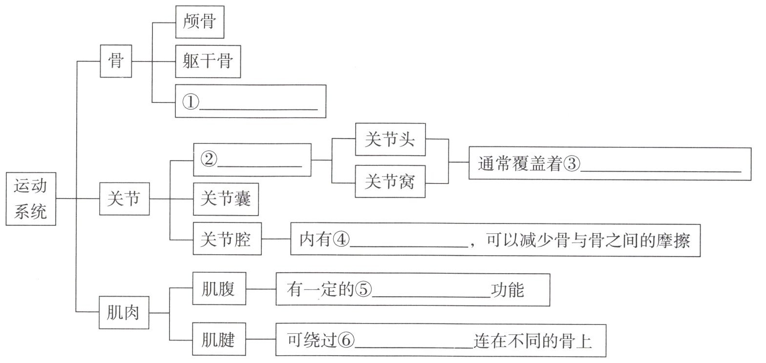 ①附肢骨 ②关节面 ③关节软骨 ④滑液 ⑤收缩和舒张 ⑥关节