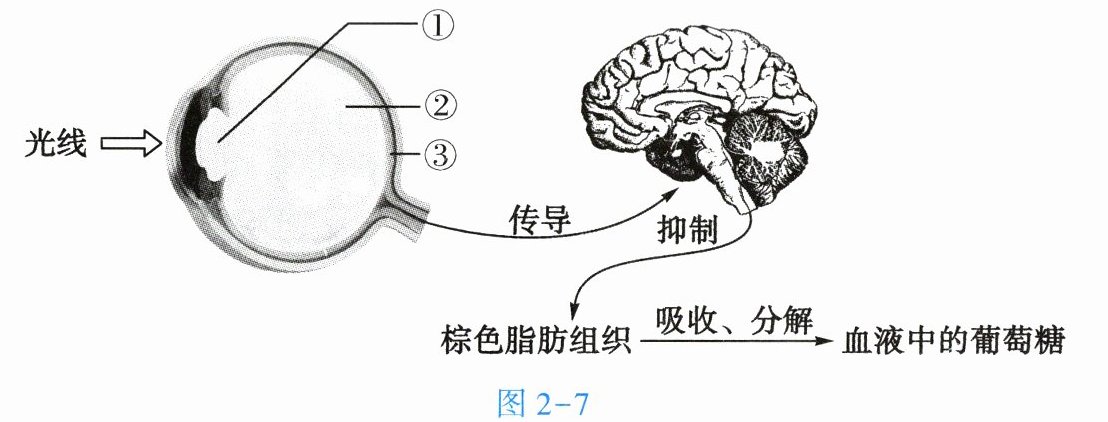21. (5 分)人体内含有棕色脂肪组织,棕色脂肪组织可吸收和分解血液中的葡萄糖,降低机体血糖浓度。我国科学家发现:光会抑制棕色脂肪组织的这项功能,其过程如图 2 - 7 所示。因此,夜间长时间暴露在人造光下可能增加患糖尿病等血糖代谢相关疾病的风险。据图回答下列问题。
