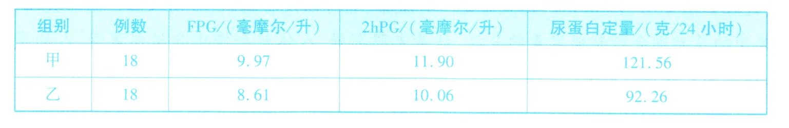 ②甲组服用不含药物的安慰剂,乙组服用黄芪消渴汤,每周进行指标测量,3周后指标数据如下表所示(数据为平均值)。
