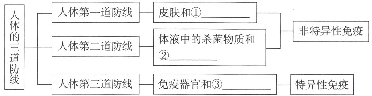 1. 结合教材知识梳理人体三道防线的相关内容。