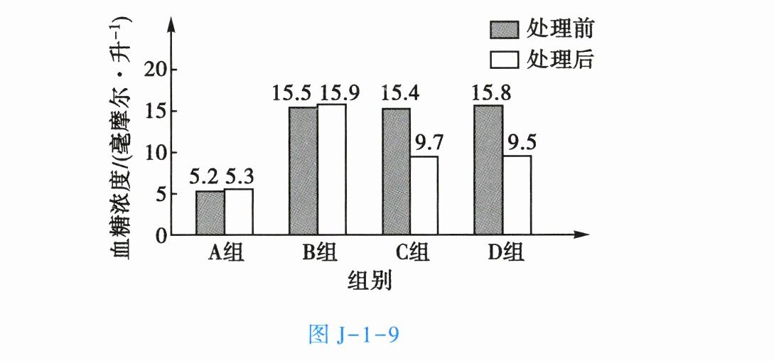 科研人员连续喂养 16 天,分别测定各组大鼠血糖浓度并取平均值,结果如图 J-1-9 所示。