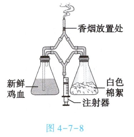 11. 为探究吸烟对肺部健康的影响,同学们在老师帮助下利用如图4-7-8所示装置进行实验。对于实验设置和结论,下列叙述正确的是【