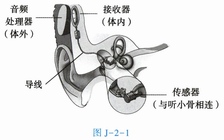 4. 振动声桥是一种植入式中耳助听装置,其结构如图 J - 2 - 1 所示。振动声桥可将外界声音进行收集、处理后,通过传感器直接带动听小骨产生振动,进而将声音信息传至内耳。下列相关叙述错误的是【