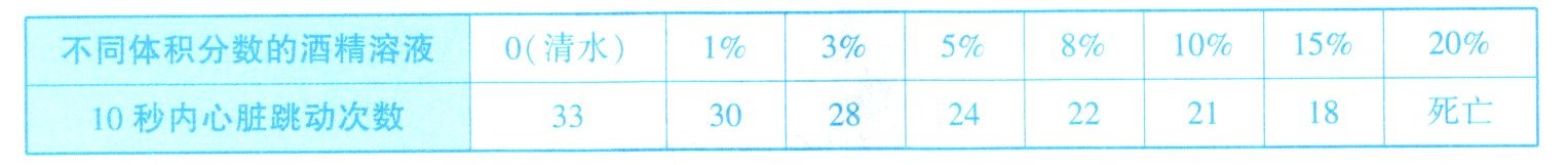 分数的酒精溶液,观察并记录这只水蚤心脏跳动次数。④换用另一只水蚤继续进行其他体积分数酒精溶液的实验,同一体积分数各取三只水蚤进行实验,然后取该体积分数酒精下心率平均值。