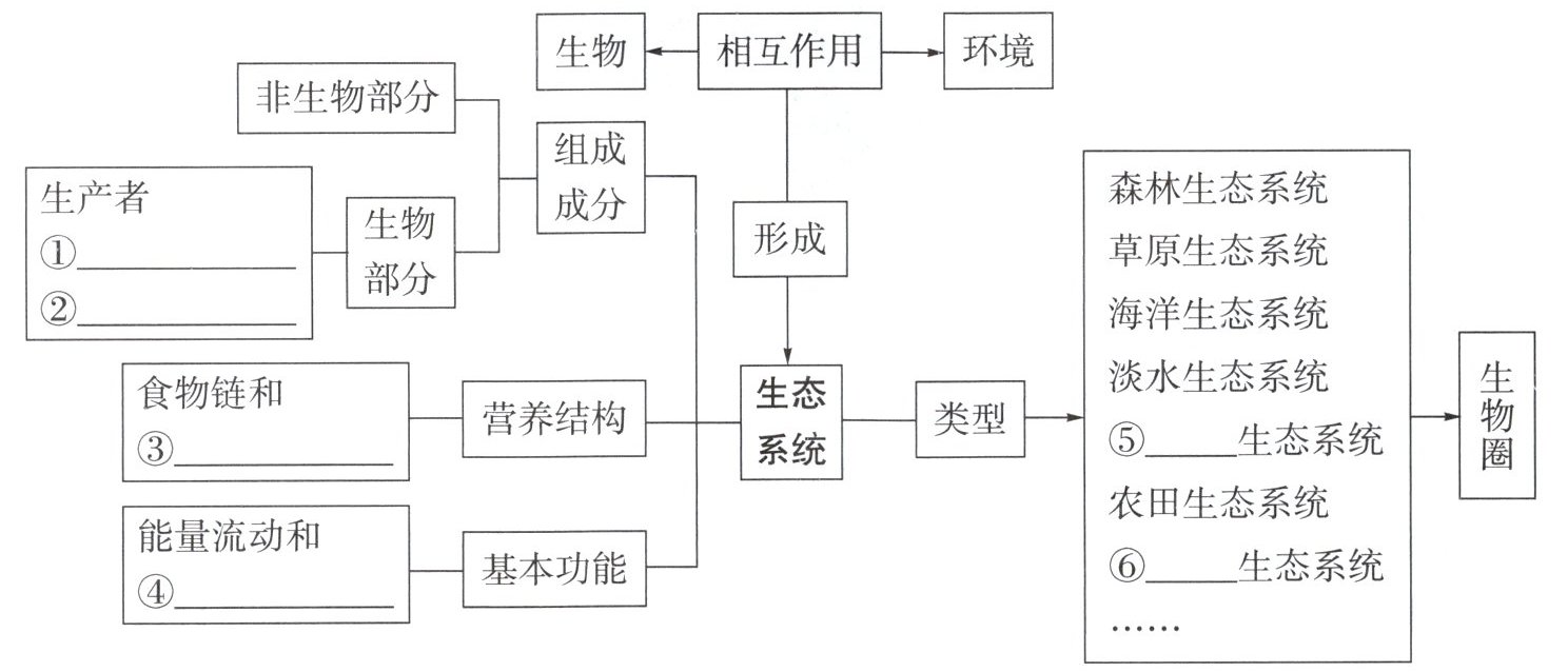 2. 在一定的空间范围内,生物与____相互作用所形成的统一的整体叫作生态系统。一片森林、一片草原、一块农田、一个湖泊、一条河等,都可以看作一个生态系统,因为这里有生物和其赖以生存的环境。