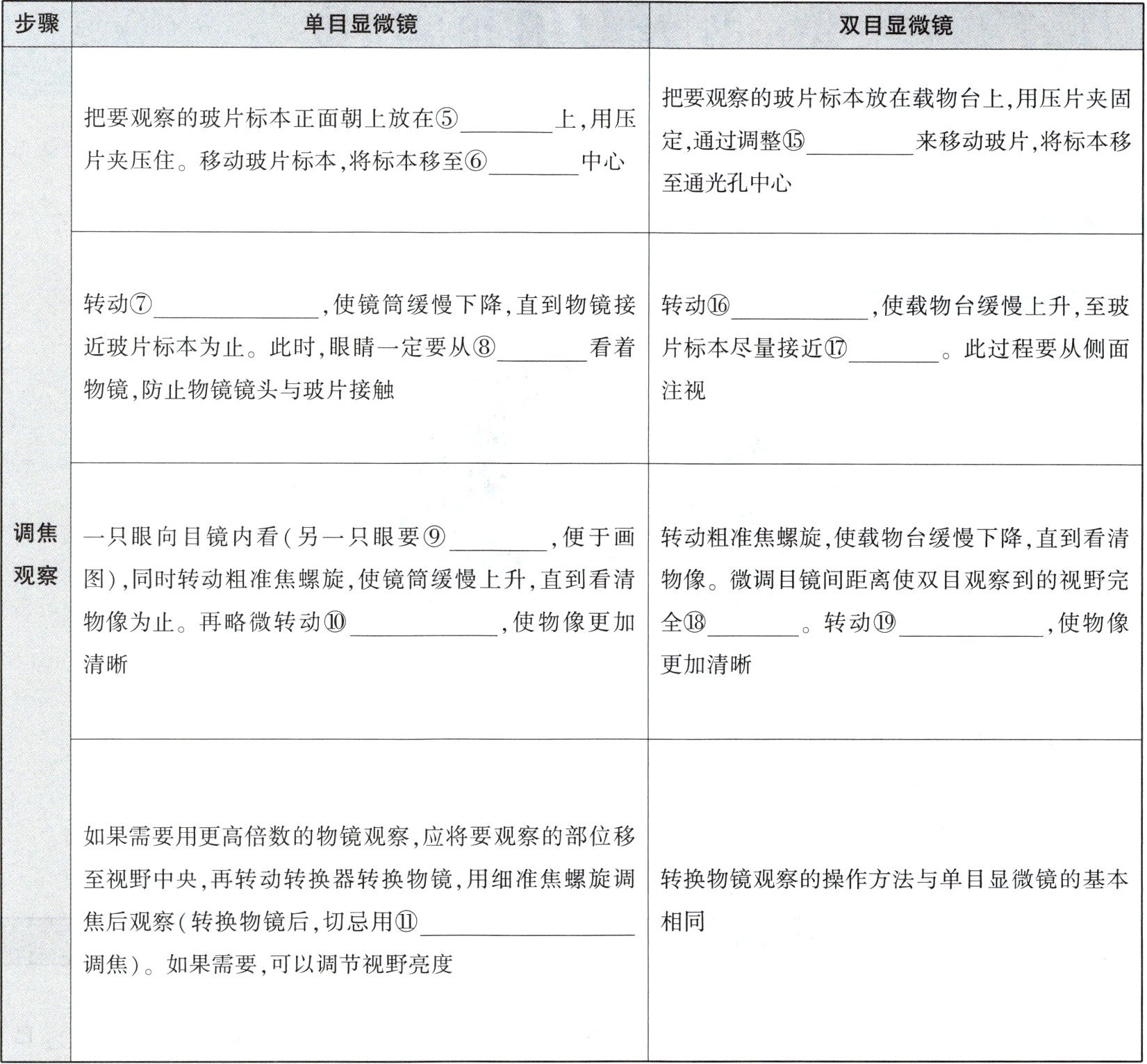 |调焦观察|把要观察的玻片标本正面朝上放在⑤____上,用压片夹压住。移动玻片标本,将标本移至⑥____中心|把要观察的玻片标本放在载物台上,用压片夹固定,通过调整⑮____来移动玻片,将标本移至通光孔中心|