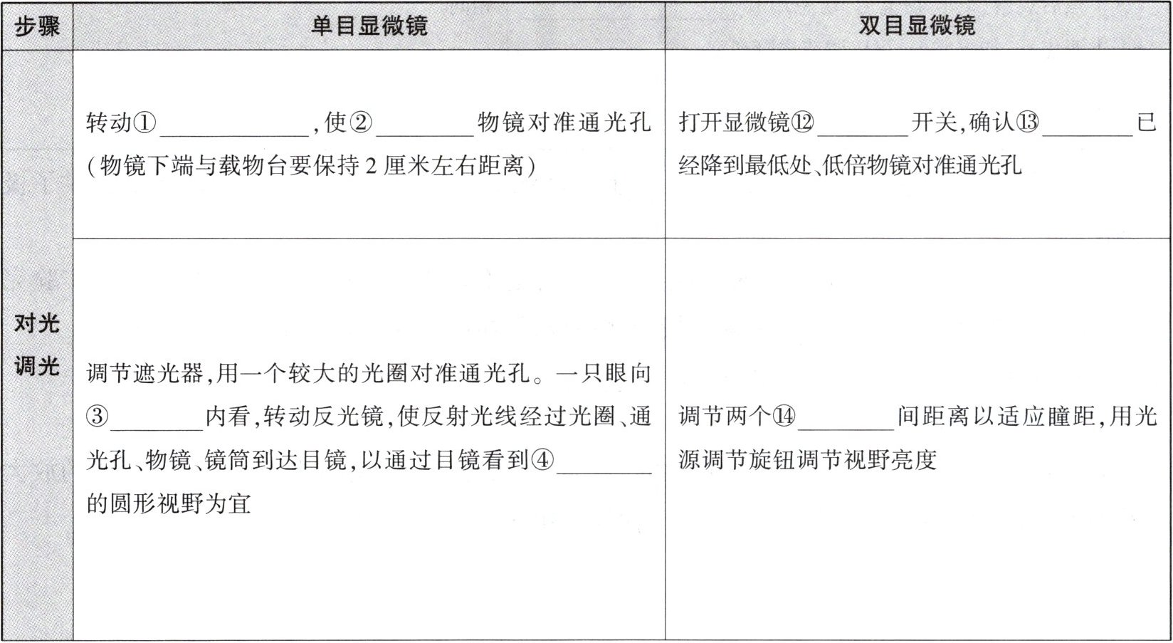 2. 比较单目显微镜和双目显微镜的操作步骤,完成下表。