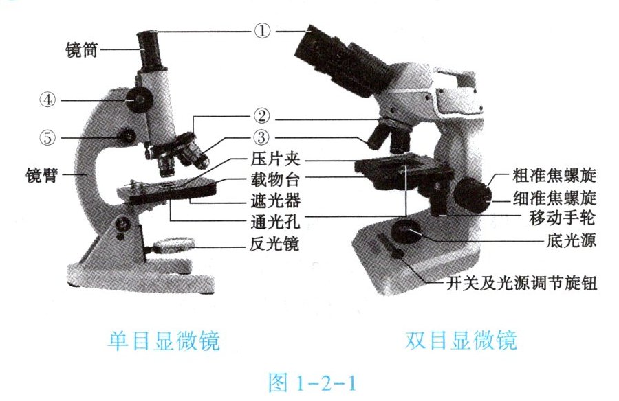 ①目镜 ②转换器 ③物镜 ④粗准焦螺旋 ⑤细准焦螺旋
