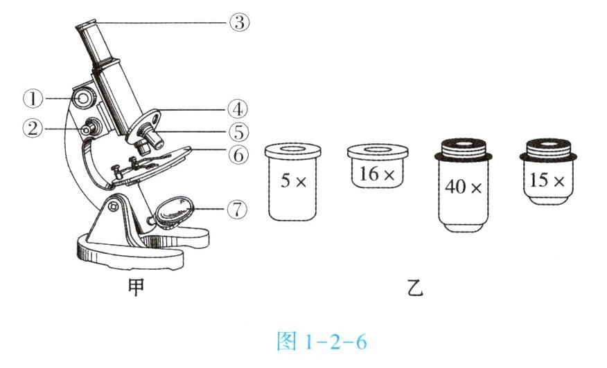 12. 生物学兴趣小组用单目显微镜观察微小的物体。如图 1-2-6 是显微镜结构示意图。回答下列问题。