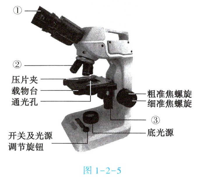 10. 如图 1-2-5 为双目显微镜。该显微镜的镜筒不能移动,可以通过转动粗准焦螺旋来调节载物台的升降,从而调节玻片与物镜之间的距离。下列叙述错误的是【 】