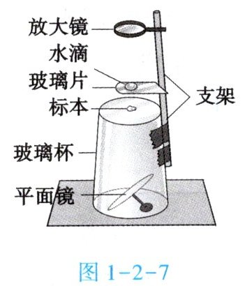 13. 小慧利用水滴(相当于凸透镜)、放大镜、平面镜等材料自制的“水滴显微镜”如图 1-2-7 所示。调节支架高度可调整标本与放大镜、水滴之间的距离,从而实现与光学显微镜相似的成像效果。回答下列问题。