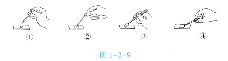 5. 如图 1 - 2 - 9 是“制作洋葱鳞片叶内表皮细胞临时装片”实验的部分操作步骤,步骤①和④滴加的分别是【 】