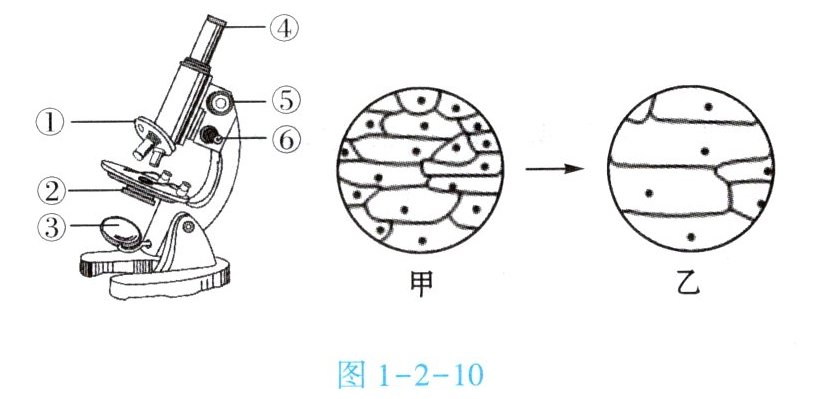 6. 康康使用单目显微镜观察洋葱鳞片叶内表皮细胞临时装片,观察到图 1 - 2 - 10 中甲、乙所示的物像。下列实验操作不规范的是【 】