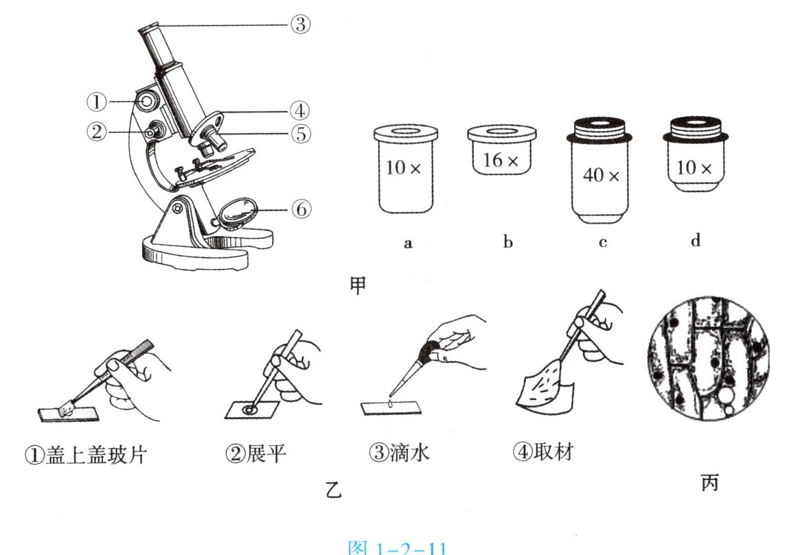 12. 用显微镜观察生物,你可以惊奇地发现一个奇妙的微观世界。生物学兴趣小组利用课余时间在实验室制作洋葱鳞片叶内表皮细胞临时装片,并用显微镜进行了观察。图 1 - 2 - 11 中甲为单目显微镜的结构示意图,乙表示制作洋葱鳞片叶内表皮细胞临时装片部分操作步骤,丙为显微镜下观察到的洋葱鳞片叶内表皮细胞。回答下列问题。