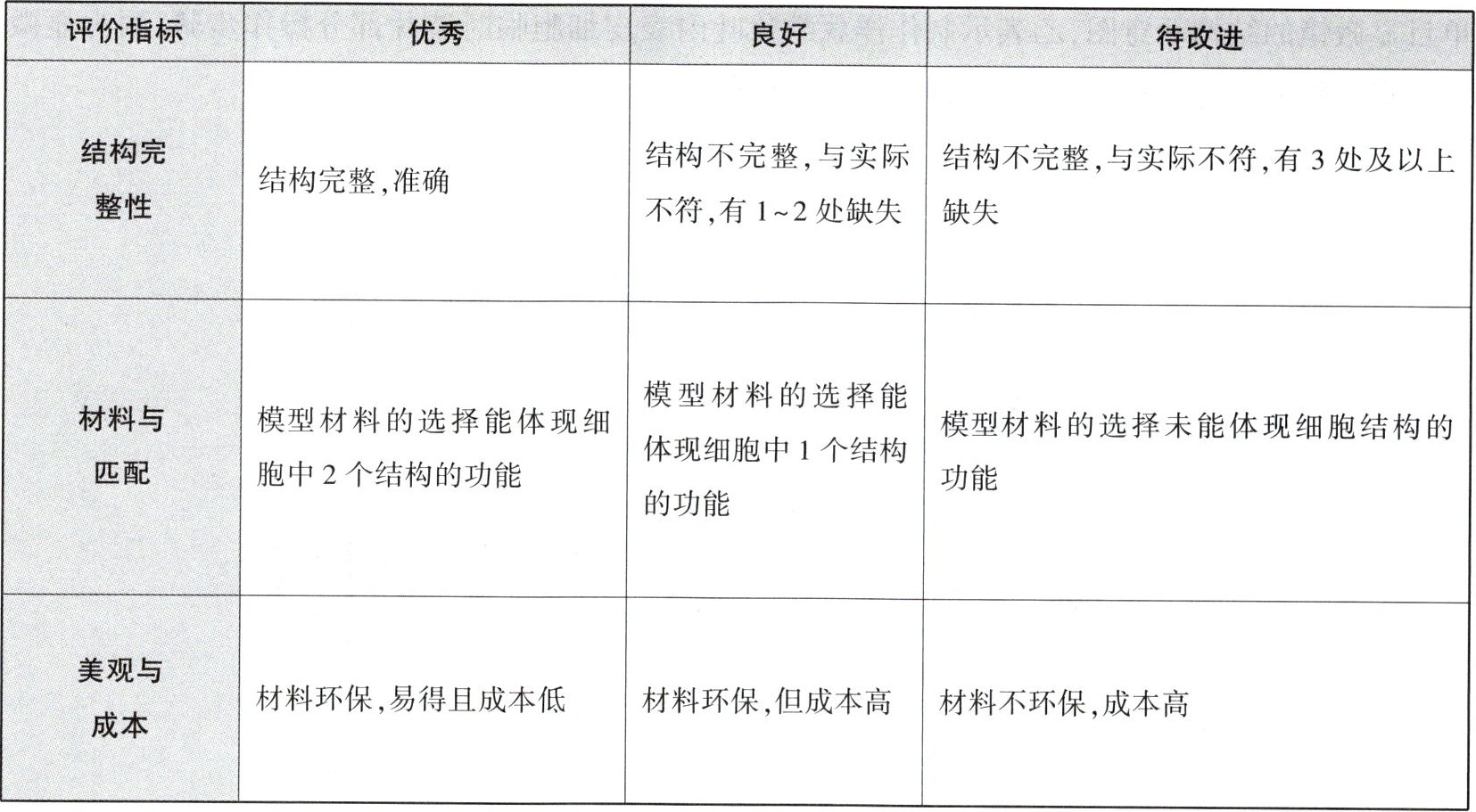 模型制作的评价指标有优秀、良好、待改进三个等级。根据如下评价标准,小慧制作的模型在表中“结构完整性”这项指标应该被评为什么等级?______,理由是______。