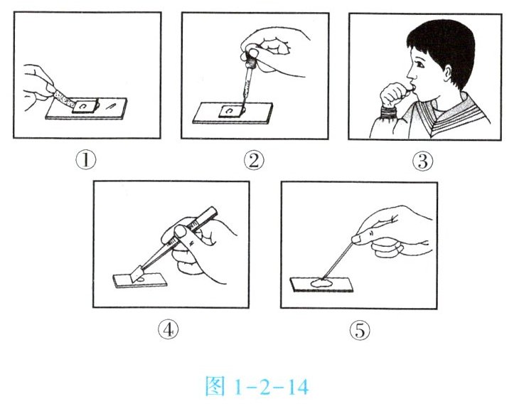 5. 如图1-2-14是制作人的口腔上皮细胞临时装片的相关过程示意图。下列叙述正确的是【 】