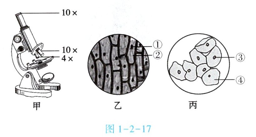 10. 小慧在单目显微镜下观察到如图1-2-17所示的洋葱鳞片叶内表皮细胞和人的口腔上皮细胞。回答下列问题。