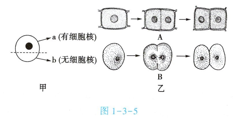 14. 实验法是现代生物学研究的重要方法。生物学兴趣小组同学为探究细胞的结构与功能的关系,选择了一种再生能力很强的单细胞动物,做了如图1-3-5甲所示的实验。图1-3-5乙为动、植物细胞分裂过程示意图。回答下列问题。