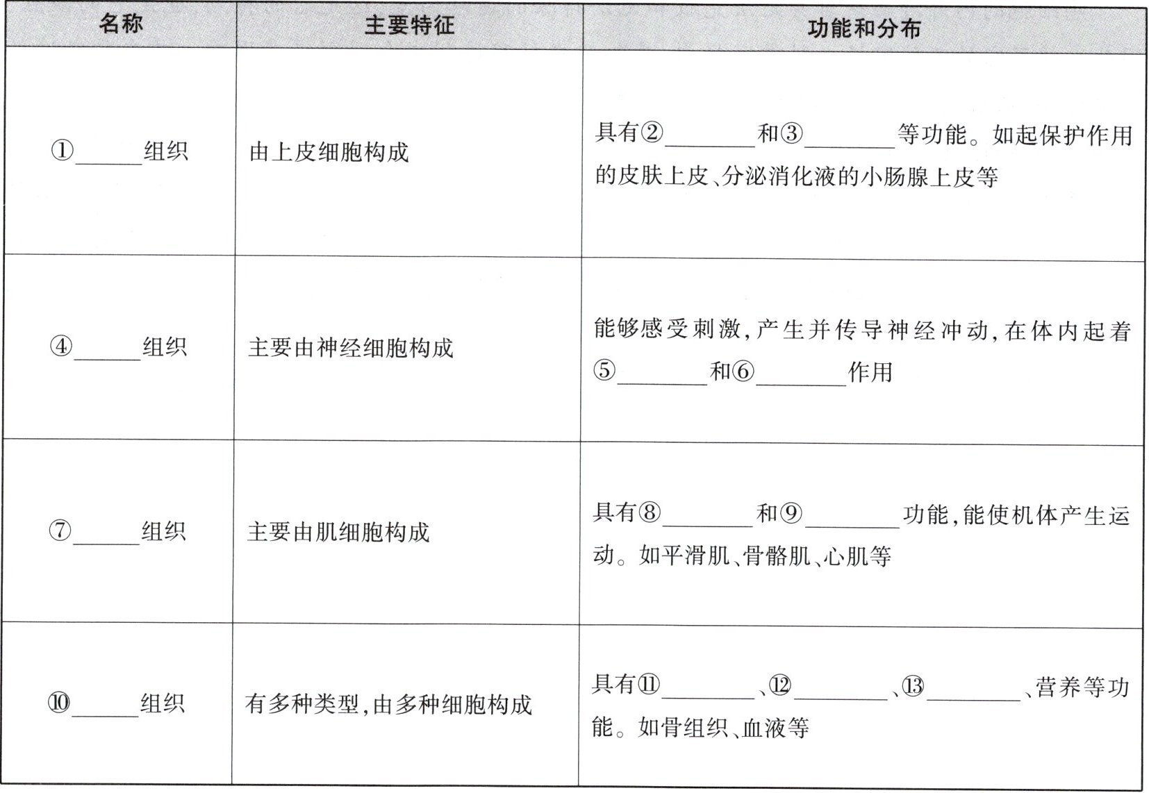 ①上皮 ②保护 ③分泌 ④神经 ⑤调节 ⑥控制 ⑦肌肉 ⑧收缩 ⑨舒张 ⑩结缔 ⑪支持 ⑫连接 ⑬保护