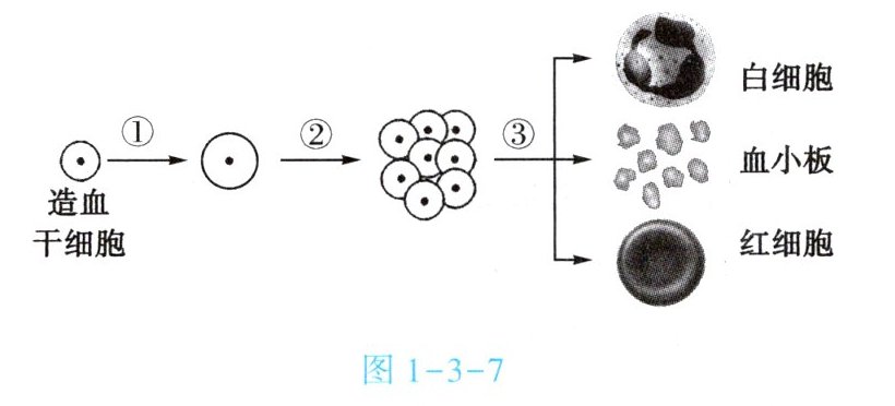 8. 造血干细胞可以“变身”成各类血细胞,如图 1 - 3 - 7 所示,该“变身”过程是【 】