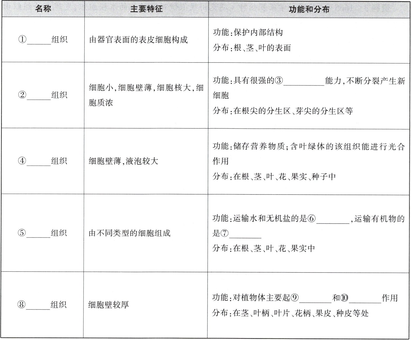 ①保护 ②分生 ③分裂 ④薄壁 ⑤输导 ⑥导管 ⑦筛管 ⑧机械 ⑨支撑 ⑩保护