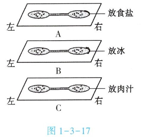 9. 生物学兴趣小组在三块载玻片的两端各滴一滴草履虫培养液,然后把这两滴培养液连通起来。接着,在三块载玻片右侧的培养液中分别放几小粒食盐、几小块冰、几滴肉汁(如图1-3-17所示),观察草履虫的移动方向。回答下列问题。