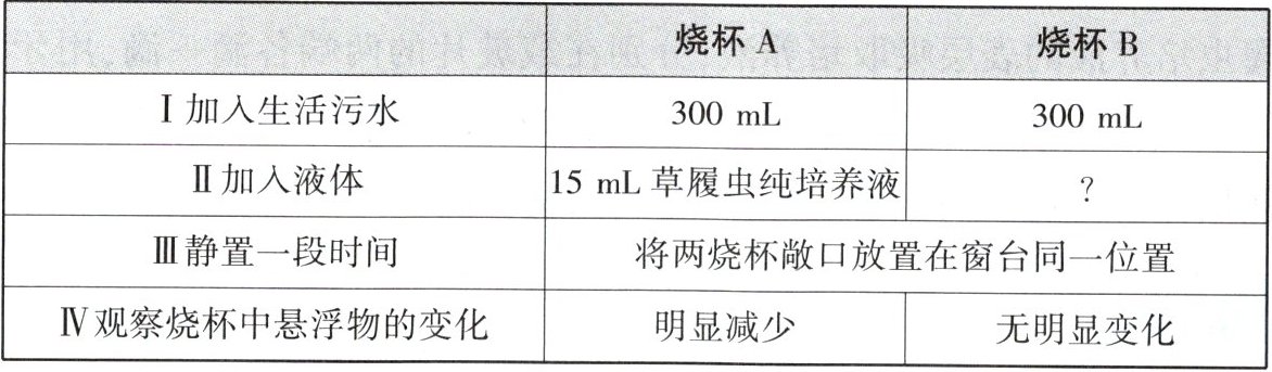 (2) 为了研究草履虫是否可以净化水质,同学们收集生活污水,摇匀后分别放入两个烧杯,处理步骤如下表所示。
