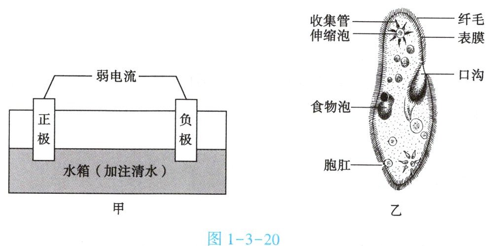(1) 分离草履虫,并进行培养。采集到的水样含有草履虫和其他小型生物及杂质。查阅资料发现草履虫在微弱电流刺激下会由正极游向负极,于是设计了水槽电极法分离草履虫装置(如图 1 - 3 - 20 甲所示)。取水样滴入图甲装置的______(填“正极”或“负极”)一侧。草履虫依靠图乙中______的摆动,几分钟后到达水箱另一侧。用吸管吸取无杂质的草履虫,注入培养液中培养备用。