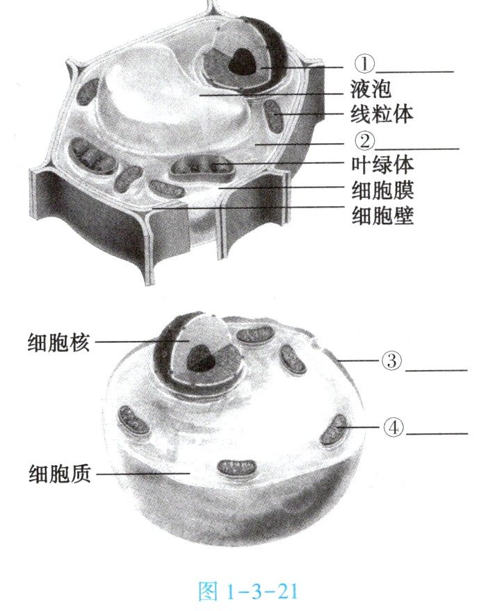 |不同点|有细胞壁和液泡,植物体绿色部分的细胞内有②____|没有细胞壁、叶绿体,通常也没有③____|