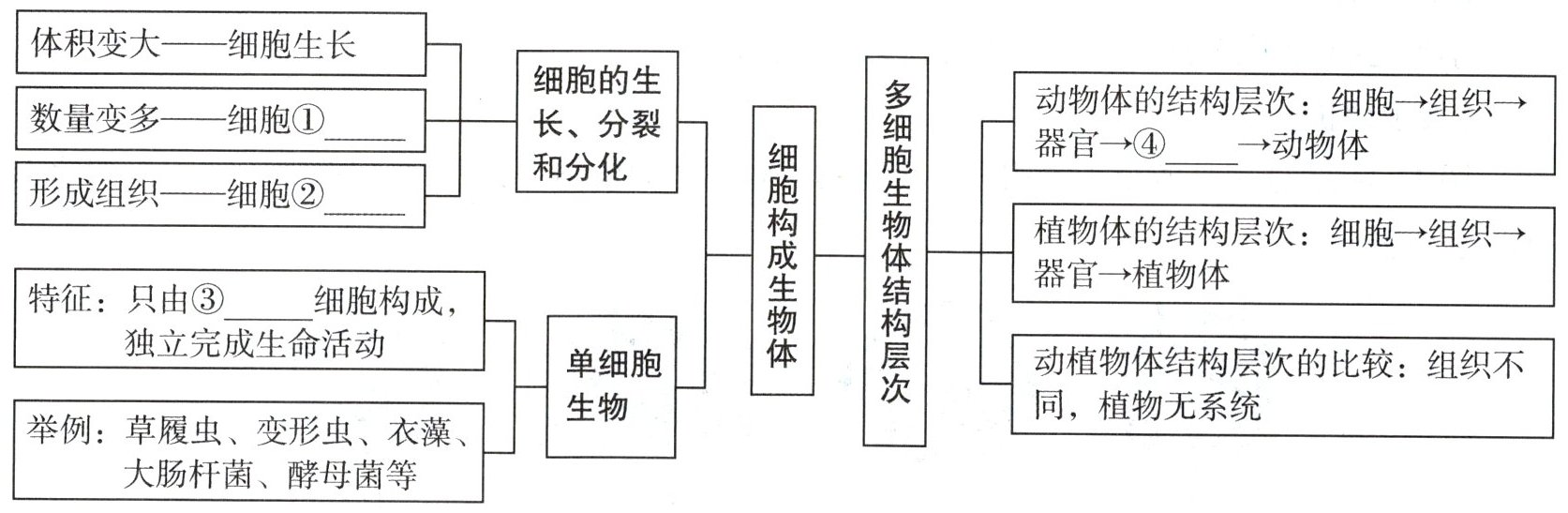 动物体的结构层次:细胞→组织→器官→④____→动物体