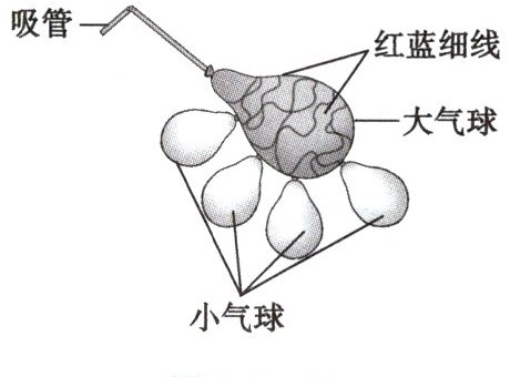 为了更好地认识鸟类呼吸的特征,某生物学兴趣小组用吸管、皮筋、大气球、小气球、红蓝细线等材料制作了一个鸟类的呼吸模型(如图2-2-18所示)。