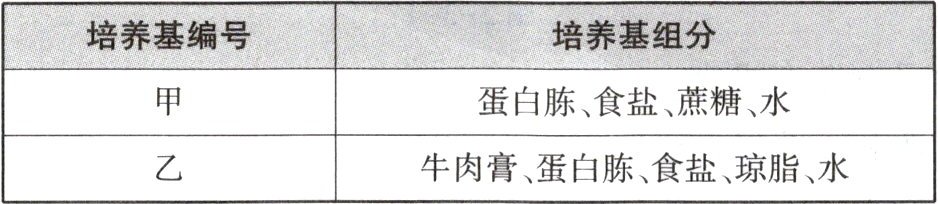(2) 该实验需选用培养基______(填“甲”或“乙”),原因是其中的______可以使培养基凝固,方便观察实验结果。根据培养基的成分可知,细菌生长所需要条件包括______、______和适宜的温度。
