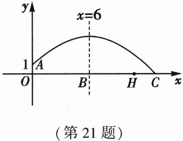 21. (10 分)(2023·安庆)如图,足球场上守门员徐杨在 $ O $ 处抛出一高球,球从离地面 1 m 处的点 $ A $ 飞出,其飞行的最大高度是 4 m,最高处距离飞出点的水平距离是 6 m,且飞行的路线是抛物线的一部分. 以点 $ O $ 为坐标原点,竖直向上的方向为 $ y $ 轴的正方向,球飞行的水平方向为 $ x $ 轴的正方向建立平面直角坐标系,并把球看成一个点.(参考数据:$ 4\sqrt{3} \approx 7 $)