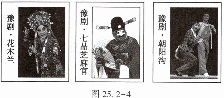 13. (★★)(2024·河南)豫剧是国家级非物质文化遗产,因其雅俗共赏,深受大众喜爱。正面印有豫剧经典剧目人物的三张卡片如图25.2-4所示,它们除正面外完全相同。把这三张卡片背面朝上洗匀,从中随机抽取一张,放回洗匀后,再从中随机抽取一张,两次抽取的卡片正面相同的概率为【