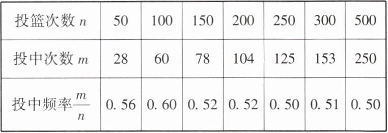 6. (★)下表记录了一名球员在罚球线上投篮的结果,那么这名球员投篮一次,投中的概率约是